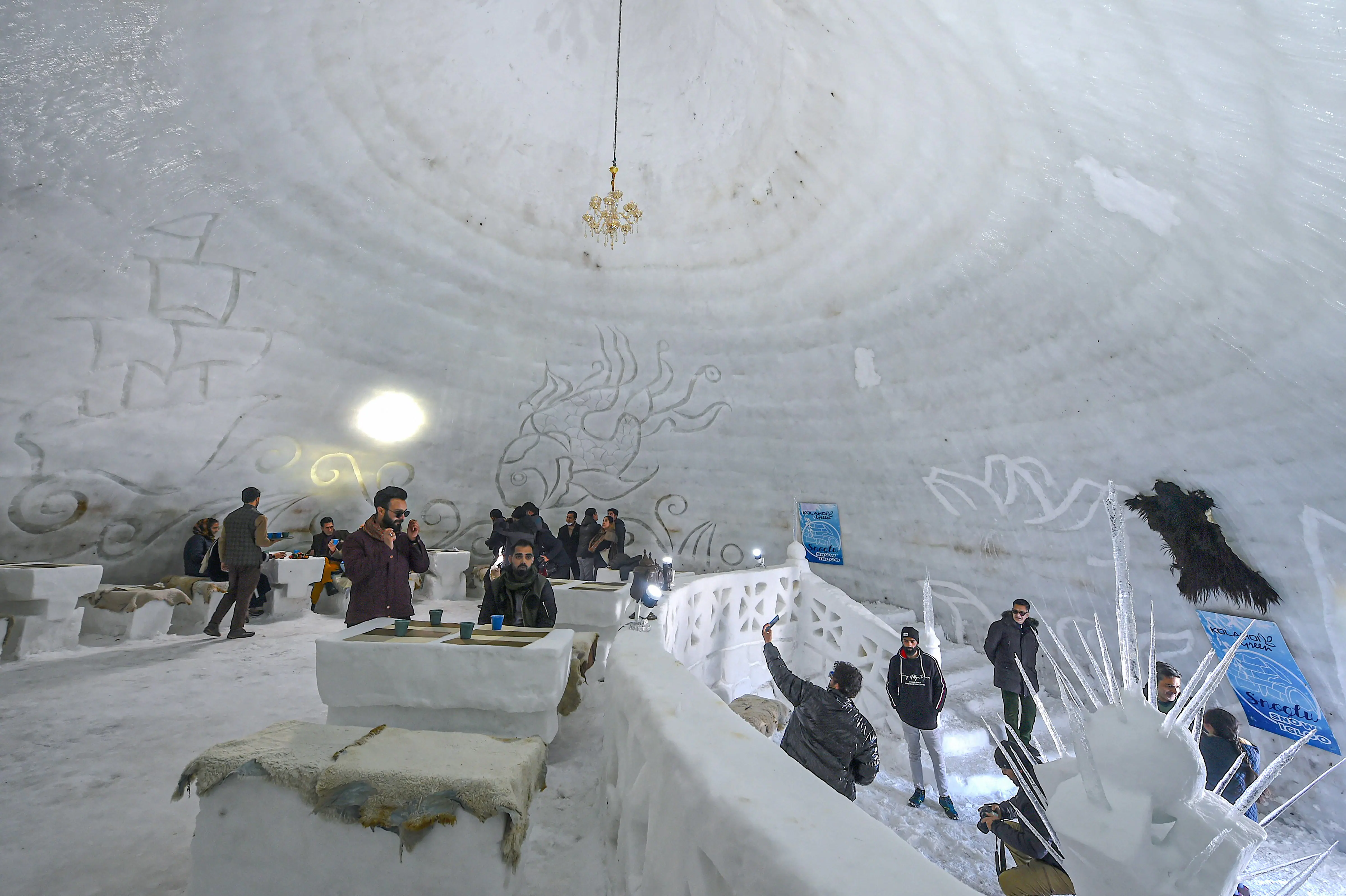 The igloo also houses some snow sculptures that represent Kashmiri culture.