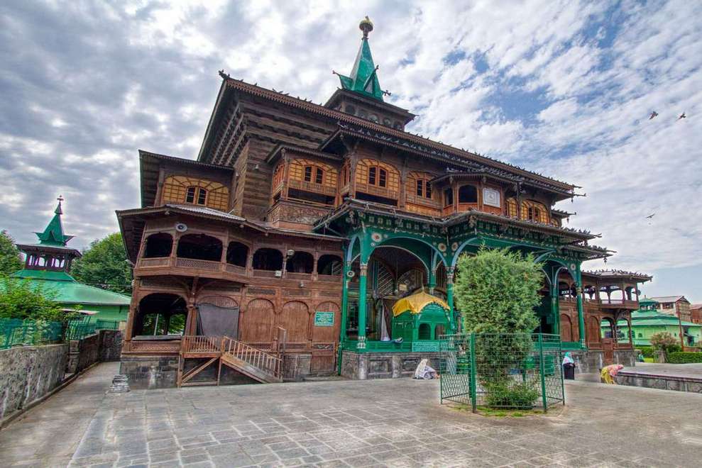 The mosque is made entirely of wood, with no nails, and is inspired by Buddhist, Hindu, and Islamic architecture. Both the exterior and the interiors are made of papier-mache. Pathar Masjid is located on the other side of Khanqah e Moula. In 1623, Mughal empress Noor Jahan erected a stone mosque. Unlike native wooden monuments, this Masjid is distinguished by its distinct designs and structural patterns. The Pathar Masjid, a desecrated edifice by Grand Mufti, is considered one of the ancient Mughal-era mosques due to its nine horizontal arches and structural style.
